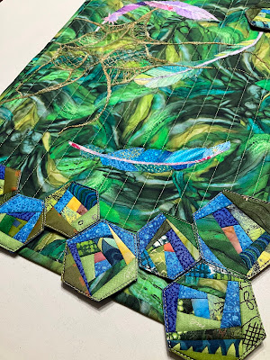 直接壓線縫製的六角形,在理解"小木屋"工法之後,不論有多少布片,都可利用模矩規範出不同大小的單元,讓作品更豐富有趣,同時可以調整壁飾尺寸與色彩,是很有趣又好用的工具型元素.